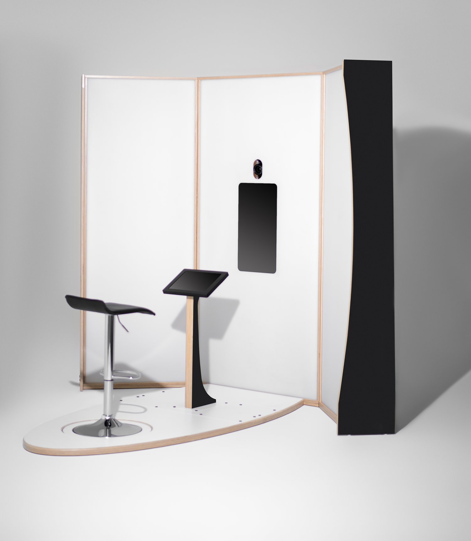 Has lights, paper rolls for backdrops, and chairs/tables you can rearrange. Companies like it because everyone's photos end up looking similar.