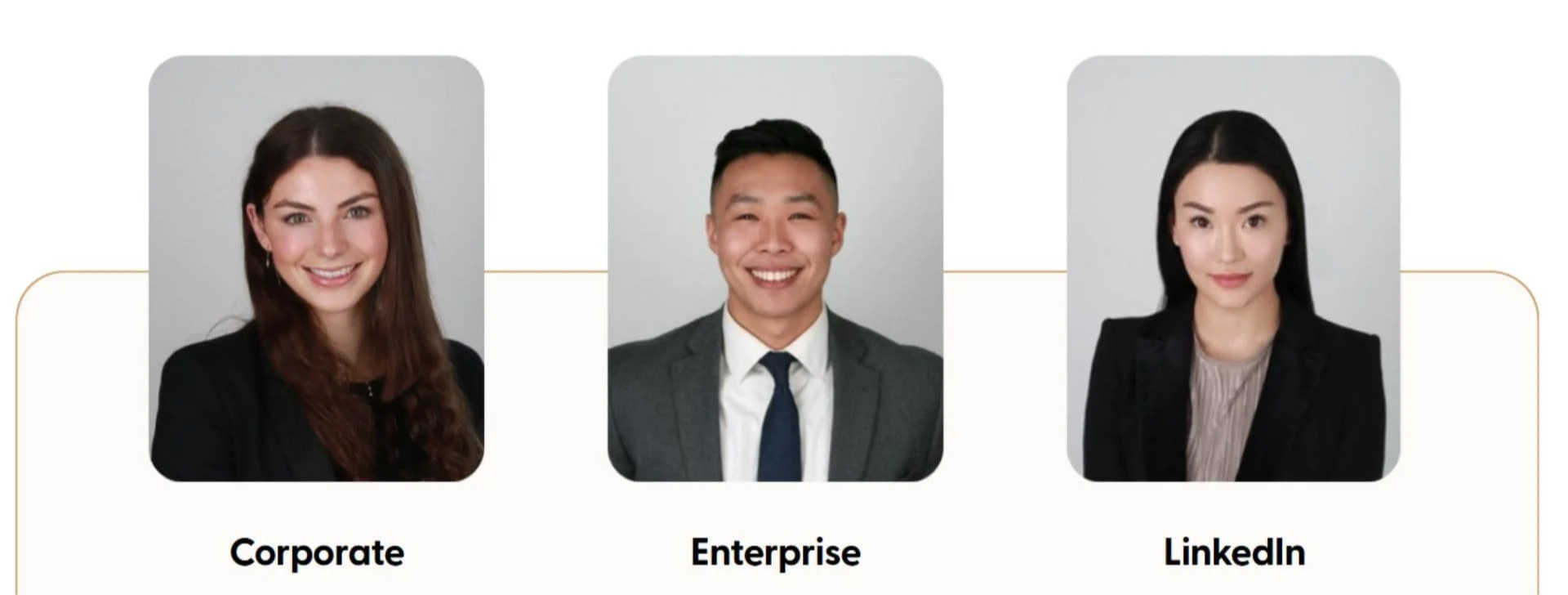 These headshots need clear facial visibility, professional attire, and appropriate expressions. The photo should look current, matching your actual appearance when meeting people in person.